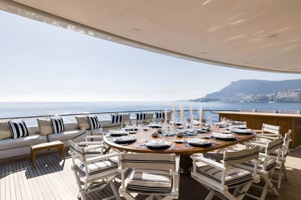 Este yate se convierte en un refugio perfecto para el descanso y el entretenimiento en alta mar. A lo largo de sus cuatro cubiertas, ofrece diversos espacios para tomar el sol, relajarse y disfrutar de cenas al aire libre bajo un dosel mientras se contempla el horizonte marino. La disposición estratégica de tumbonas y áreas de descanso asegura que cada huésped tenga un lugar cómodo para disfrutar del sol y las vistas panorámicas. Este enfoque en el confort y el entretenimiento hace de este yate un espacio ideal para largas travesías en compañía de amigos o familia.