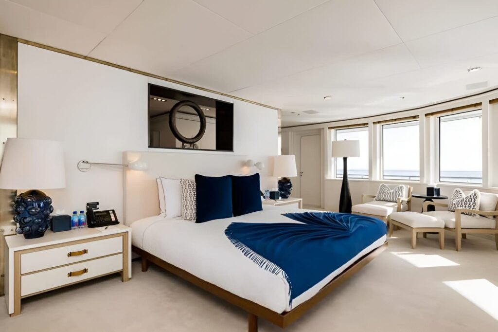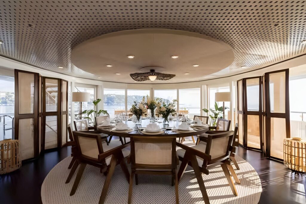 El diseño no deja espacio sin utilizar, y cada detalle ha sido pensado para maximizar la comodidad de sus 22 huéspedes. Sus interiores reflejan un ambiente fresco y natural que evoca la serenidad del mar. Con 11 suites suntuosas, incluyendo una suite principal con un lujoso baño en suite, el yate ofrece una atmósfera de lujo discreto y elegancia atemporal. Las áreas comunes, llenas de luz natural y decoradas con madera y tonos suaves, crean un entorno relajado que evoca la esencia de una villa frente al mar.
