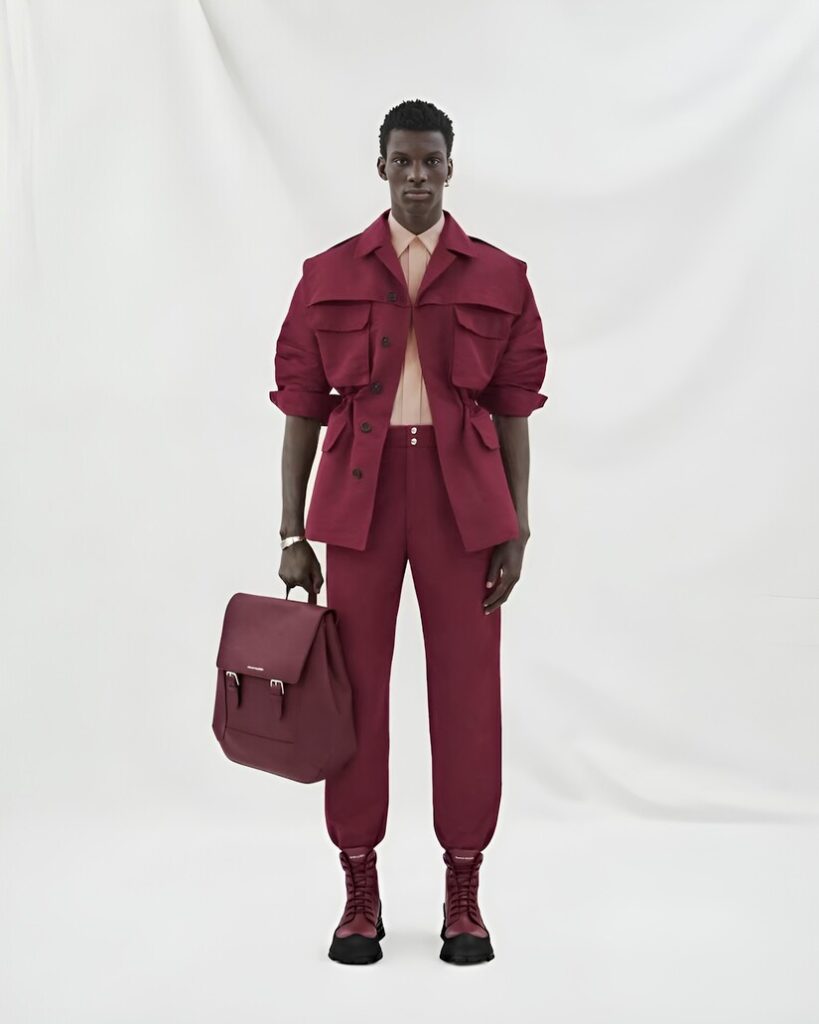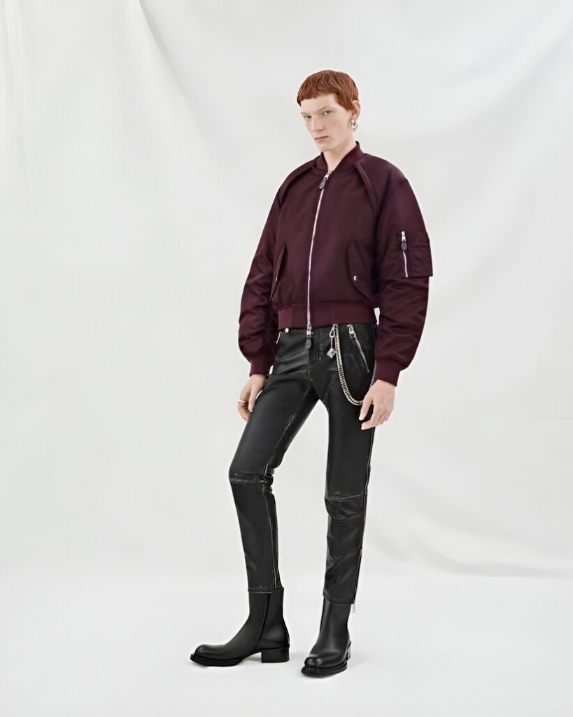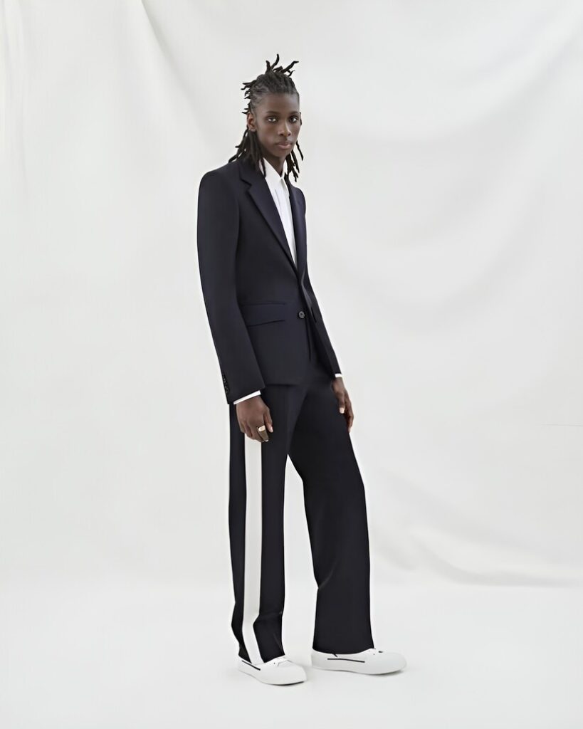 La propuesta de esta temporada combina tradición y modernidad, rindiendo homenaje al estilo clásico británico con un enfoque renovado. Los trajes en tonos burdeos, con rayas finas y hombros estructurados, integran detalles distintivos como la emblemática barra en T. La colección mezcla elementos formales e informales: prendas de mezclilla lavadas a la piedra para el día, y chaquetas de ante crudo adornadas con cristales y malla, logrando un equilibrio único entre lo cómodo y lo casual.