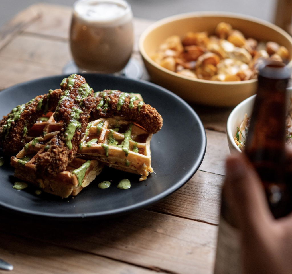 Ahora, hablemos de la comida. Pedimos los Chicken & Waffles porque había que ver si estaban a la altura del hype… y vaya que lo están. Crujientes, jugosos y con el balance perfecto entre lo dulce y lo salado. Luego, probamos un avocado toast con pesto que le daba un giro inesperado al clásico de siempre, y un toast de burrata con aguacate y fresa que fue un viaje entre lo cremoso, lo fresco y lo dulce. Para acompañar, pedimos una ronda de capuchinos con leche de almendra, bien preparados, con espuma suave y el balance justo entre intensidad y cremosidad.