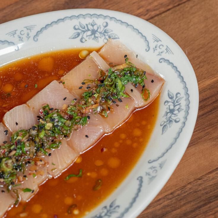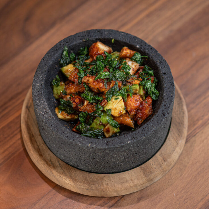 El restaurante celebra al fuego como elemento central de su propuesta. Cada platillo parte de la brasa como técnica, como lenguaje y como símbolo. Aquí, los cortes Prime y Wagyu se cocinan en hornos Josper que aportan intensidad, textura y carácter. Las proteínas conviven con vegetales del desierto, pescados del Pacífico mexicano, mariscos de temporada y tortillas hechas al momento. El taco de asada al carbón —una joya del norte— convive en carta con platillos como el lechón confitado de piel crocante, los crudos de Hamachi con salsa de chiltepín, la trucha ahumada al mezquite o los tuétanos rostizados que evocan rituales ancestrales con un giro sofisticado. La cocina de Cuerno no se disculpa: tiene identidad, orgullo y visión.