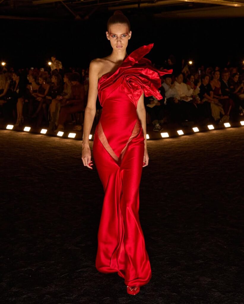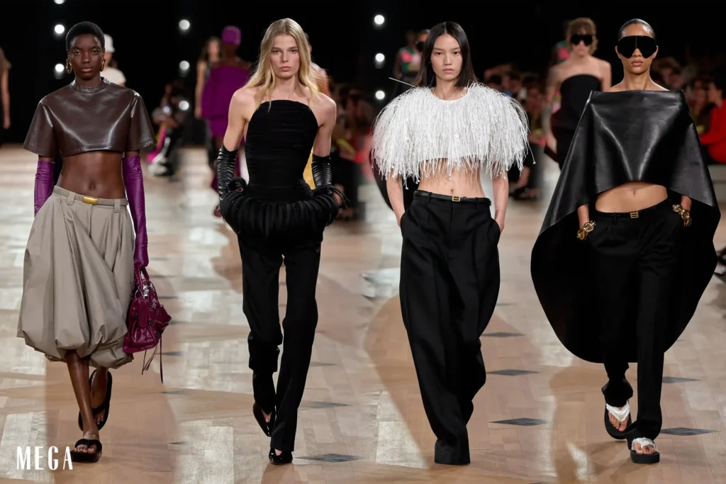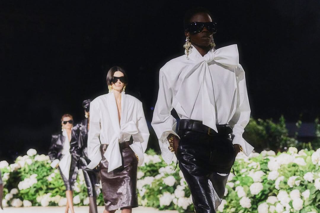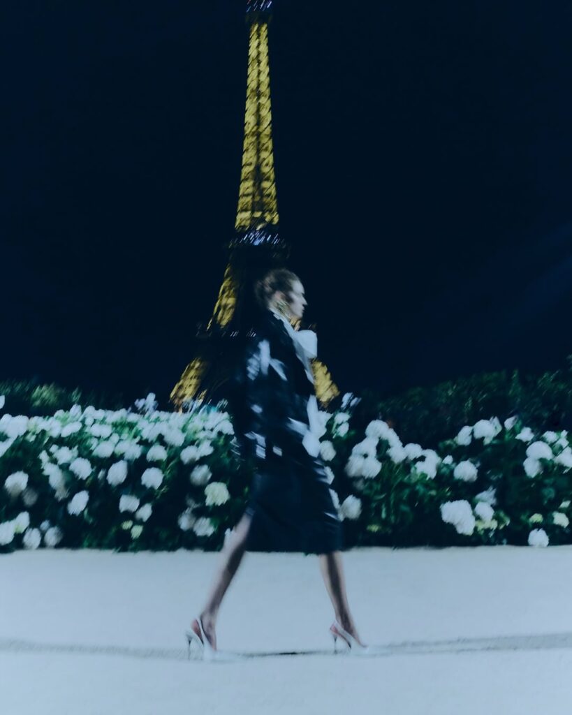 Saint Laurent abrió la edición SS26 bajo la icónica Torre Eiffel con un espectáculo cargado de glamour ochentero. Anthony Vaccarello reafirmó la fuerza de la feminidad contemporánea con hombreras marcadas, cuero negro, faldas lápiz, transparencias y vestidos con vuelos y volantes. La colección combinó sensualidad y potencia, recordando que la silueta sigue siendo el gran lenguaje de la Maison. Cada look destacó por su sofisticación y elegancia clásica.