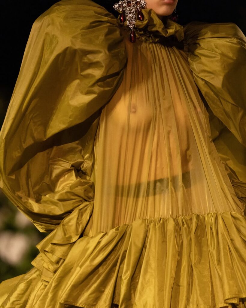 Daniel Roseberry llevó el surrealismo al límite, mezclando fantasía, estructuras exageradas y dramatismo visual. Cada look se convirtió en una performance que desafía lo utilitario, reafirmando la identidad de la Maison.