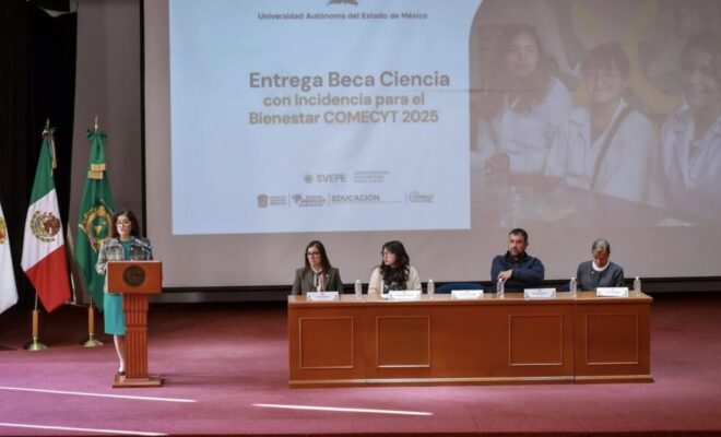 La rectora de la Universidad Autónoma del Estado de México (UAEMex), Martha Patricia Zarza Delgado, presidió la entrega de la Beca Ciencia con Incidencia para el Bienestar 2025, otorgada en colaboración con el Consejo Mexiquense de Ciencia y Tecnología (COMECyT), con el objetivo de impulsar el desarrollo académico y social de la comunidad universitaria. Durante el acto realizado en el Auditorio del Centro Universitario UAEM Valle de México, Zarza Delgado y el director general del COMECyT, Víctor Daniel Ávila Akerberg, entregaron de manera simbólica 10 de las 336 tarjetas de este estímulo a estudiantes destacados de la universidad.